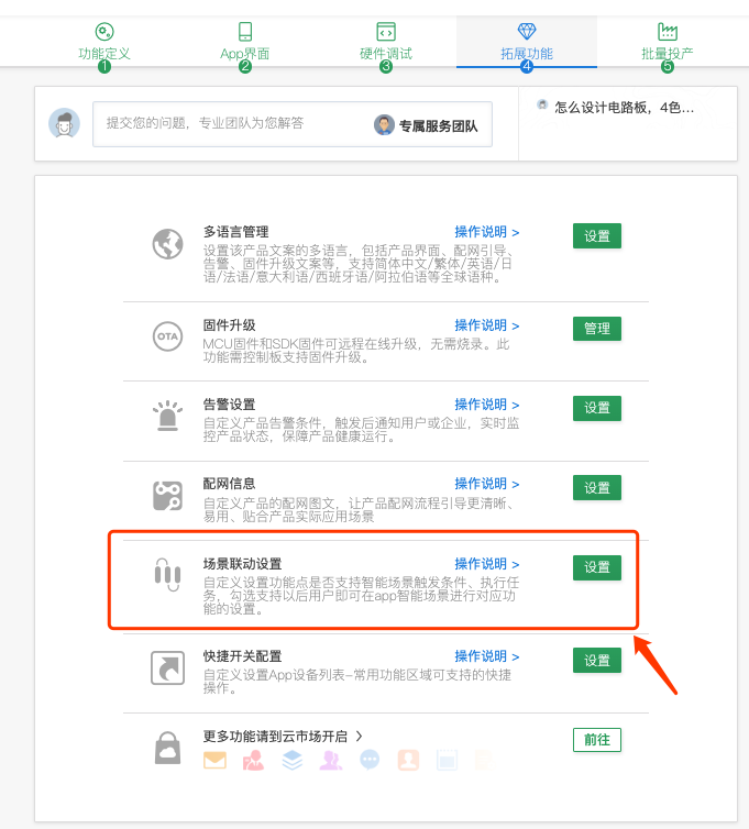在涂鸦iot平台产品开发第四步:拓展功能-场景联动设置 这里,可以对需要支持智能场景设置的功能点进行勾选,勾选以后消费者即可在app智能场景进行对应功能的设置。
